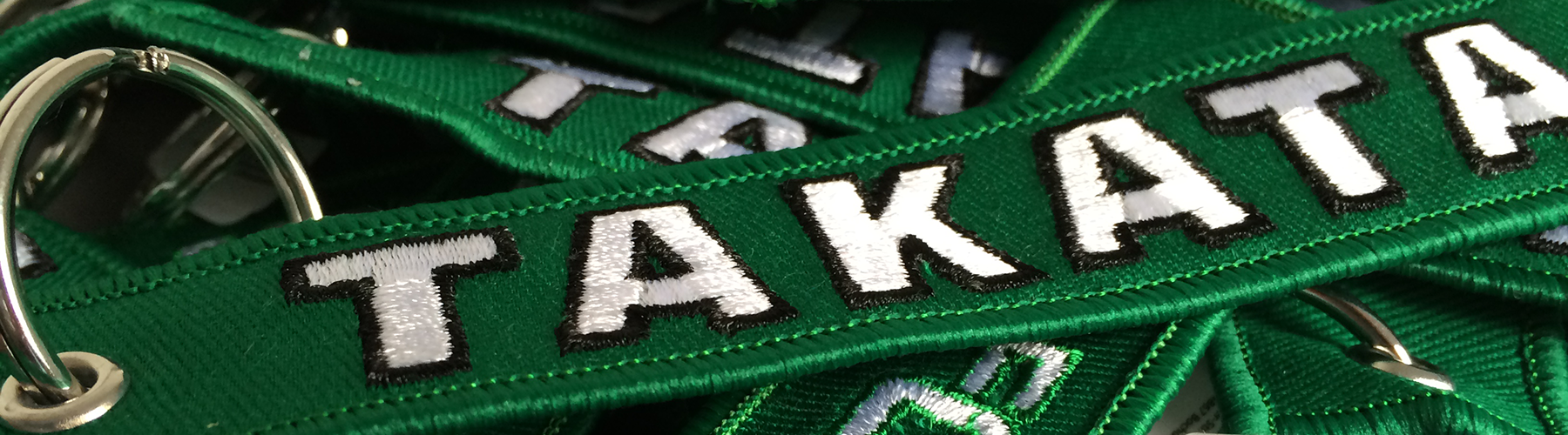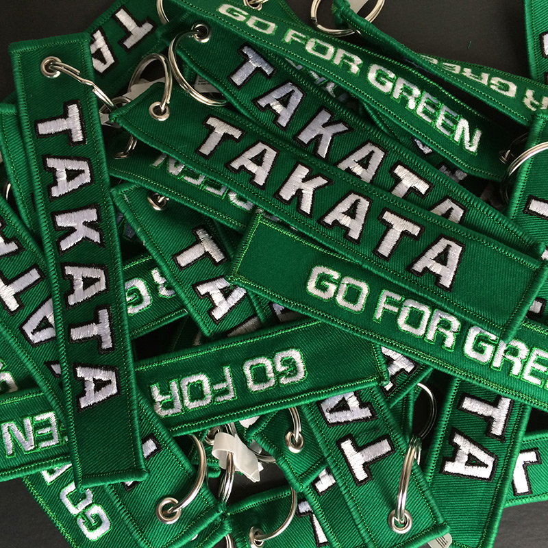 Our Takata branded keychains, with "Go For Green" on reverse.